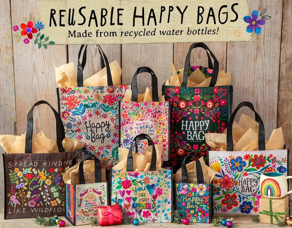 Happy Bags are the perfect mix of purpose and personality. Each bag is made from recycled plastic bottles and designed to be reused again and again. With colorful prints and inspiring messages, these Natural Life bags turn something simple into something beautiful.